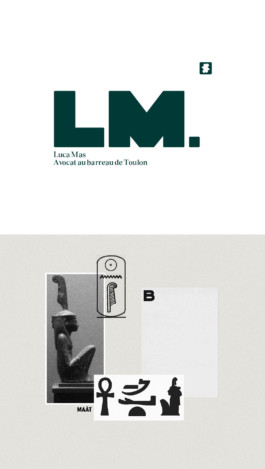 Identity for the Lawyer Luca Mas, Logo & monogram based on the Egyptian Godess of Justice Mâat attribute, the feather.